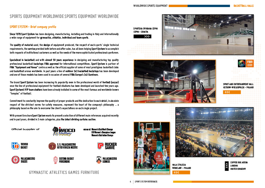 Aggiornata ad Ottobre 2025 la raccolta delle principali referenze internazionali di Sport System. Dagli outdoor 3×3 ai palazzetti multifunzione indoor fino agli stadi di calcio… con le attrezzature che rappresentano l’eccellenza di Sport System. Spicca anche una sezione dedicata alla linea di pareti divisorie, tribune e arredi! Qualità, design, funzionalità e sicurezza.