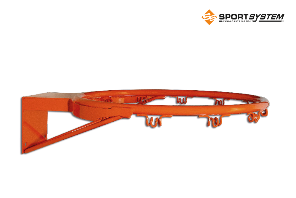 Canestro regolamentare reclinabile in acciaio verniciato a norma EN 1270. Cerchio in tubo pieno di acciaio, diametro mm 20. Meccanismo interno di abbassamento a molle di acciaio registrabili.