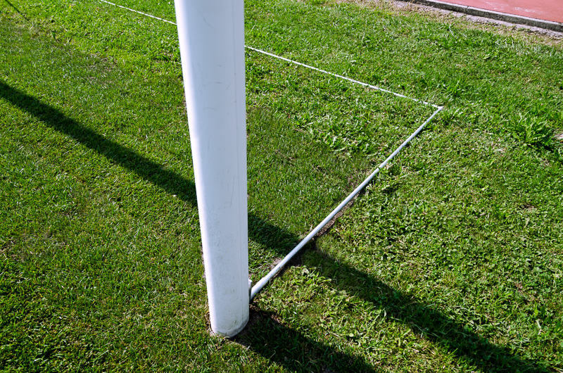 Coppia porte gioco calcio ridotto con dimensioni interne cm 500×200, modello mobile con base. Realizzate in tubolare di acciaio verniciato con sezione rotonda di mm 80. Complete di base posteriore di sostegno realizzata in profilo di acciaio verniciato e sistema di fissaggio rete con cordino passante tra canaline in acciaio.