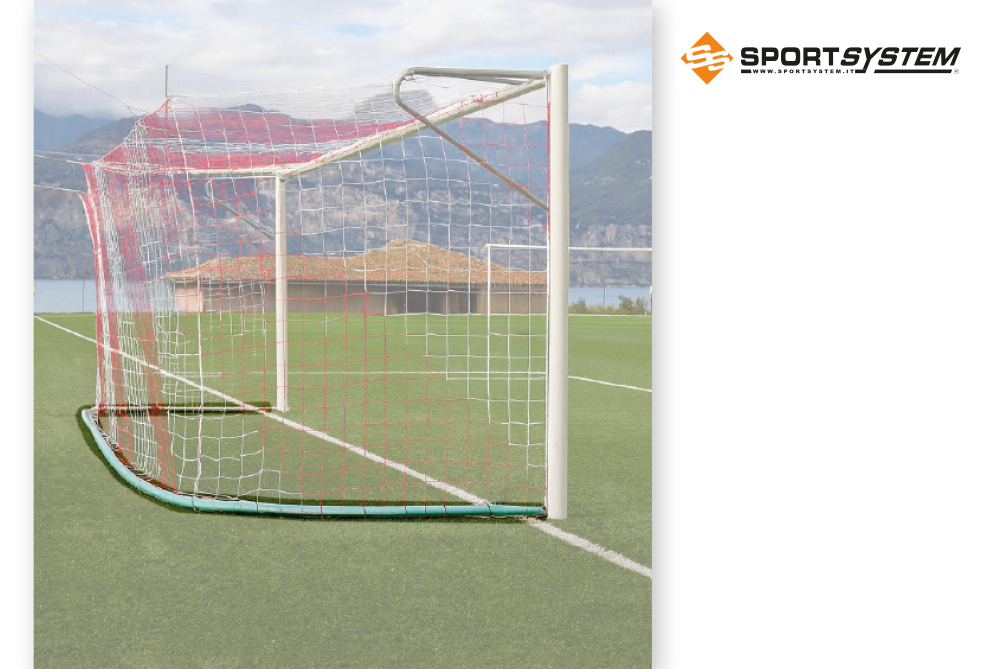 Coppia porte gioco calcio ridotto con dimensioni interne cm 500×200, modello mobile con base. Realizzate in profilato di alluminio con sezione rotonda di mm 80. Giunzioni angolari in fusione di alluminio ad innesto. Complete di base posteriore di sostegno realizzata in profilo di alluminio con predisposizione per inserimento ruote di trasporto e ganci di plastica per attacco reti.