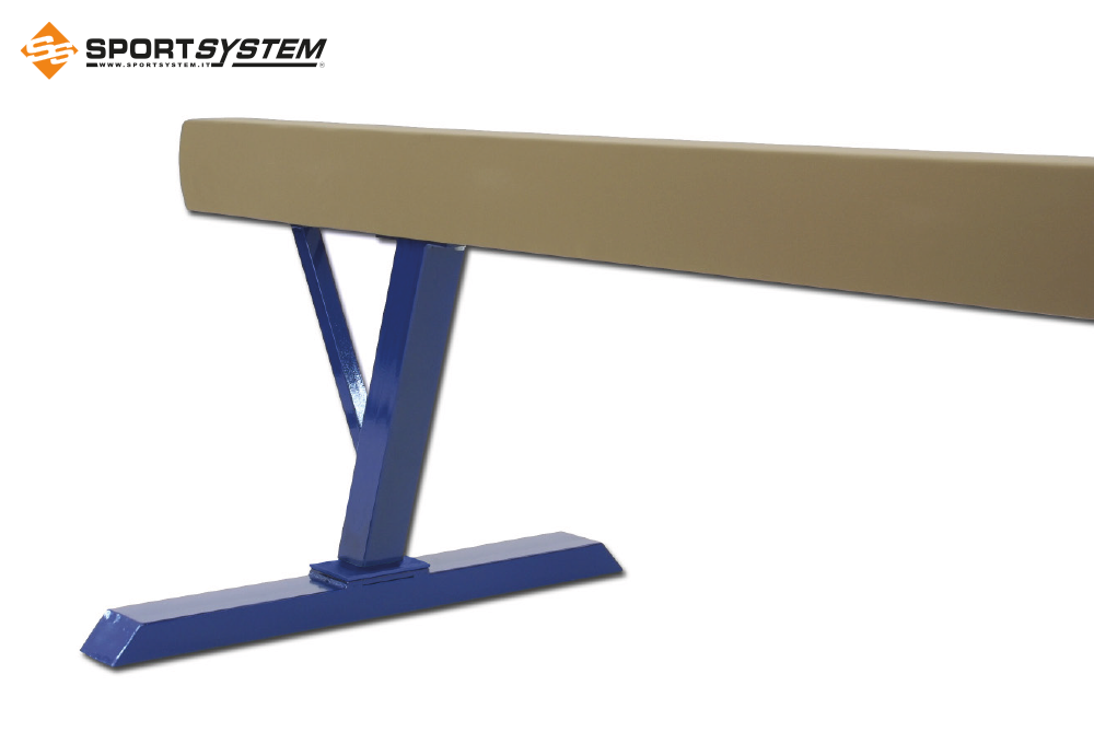 Women’s balance beam, made of aluminium and covered with suede synthetic leather, length 5 mt, section 13×16 cm, with rounded sides and walking area of 10 cm. Varnished steel supports with rubber covered floor pads for using the beam at a fixed height, ground level.