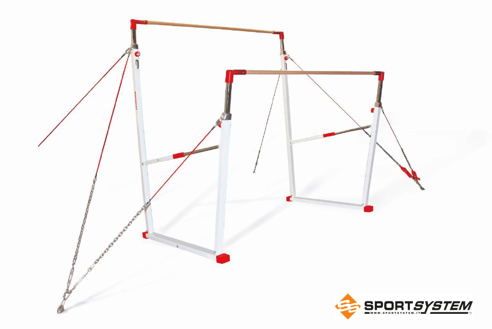 Asymmetric bars F.I.G. approved for competitions. Fibreglass bars covered with wood. Lower bar adjustable in height from 160 to 175 cm. Upper bar adjustable in height from 240 to 250 cm. Varnished steel structure complete with cables, tensioners and fixing accessories.