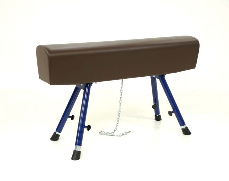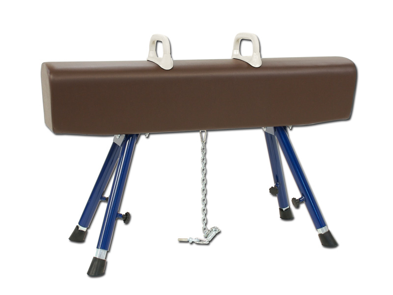 “Olympic” horse suitable for competitions, double steel tubular legs equipped with automatic height regulator for adjusting to required heights; transport devices included. Tightening chain and anchor wedge for fixing to the floor. Padded wooden trunk covered with suede like leather.