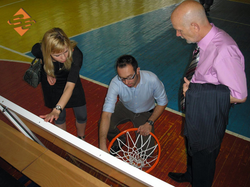 Sport System visiting in Chisinau the Basketball Federation of the Republic of Moldova. Mr Simone Pradal explains use of supplied equipments to the president mr Vasily Shlyagun, to the vice-president ms Larisa Jarkovskaya and to the sports director mr Sergey Tyslenko.