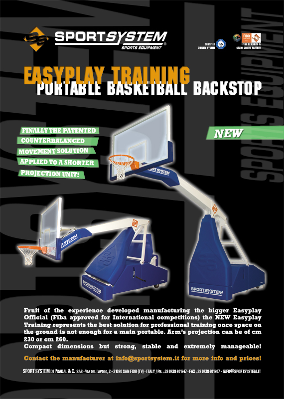 Launched on the market during the last FSB trade fair in Cologne the new Easyplay Training (projection cm 230) portable basketball backstop characterized by the patented counterweight movement. For info: info@sportsystem.it